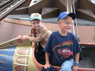 nemo ride. The line was OVER an hour long! Adam was sad about that. Will have to wait until another time.The boys after the rocket ride!