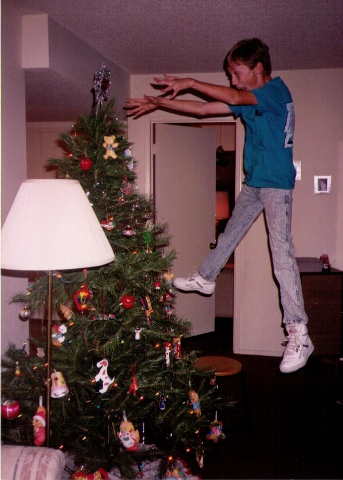 That is too funny! I remember that photo! Yea Spring he was jumping off the little stool in the picture and I’m pretty sure we were putting tinsel on the tree! I don’t know who took the photo though…probably our mom unless that was the year our Uncle came down at Christmas!