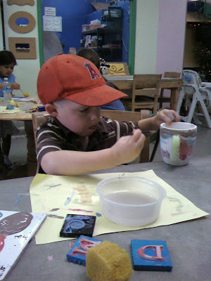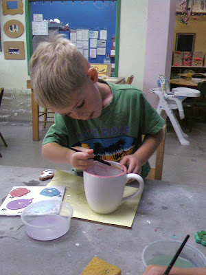 Colby (one of Adam’s good friends) had his Birthday party at the Ceramics place. Adam picked out a neat mug for his hot chocolate. It should be finished in a few days! Mommy can’t wait to go back again and take Gregory. Gregory would really like doing sometime like this (he’s more into arty things!) Sorry for the pictures, I only had my cell!