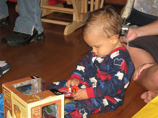 John David opening the CARS toy we got him for his FIRST Birthday