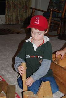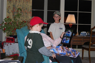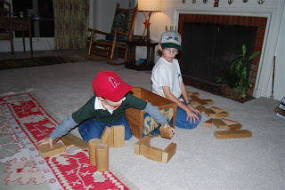 We traveled up to Santa Barbara tonight to visit Gran and bring dinner to share. We had a nice visit and the boys enjoyed playing with the good ‘ol blocks that Brian used to play with when he would come as a child. Despite Brian dropping my crock pot (after dinner thankfully) and it breaking all over the kitchen floor, we had a great time. Then we went to Oxnard and saw all the neat lighted houses on Christmas Tree Lane.We gave Gran a family picture for Christmas.