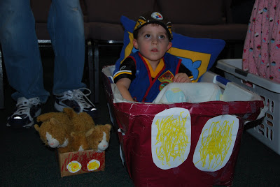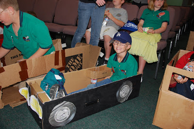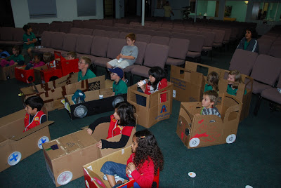 The kids make cars out of boxes and then we watch a movie in church! Adam was having so much fun this year making his car. He was even more excited to actually make a car for his three kitties. It was pretty cute!