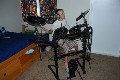 We are in the process of fixing up the laundry-room (which is where the drums will be kept). Gregory gets Daddy’s drums in his room for a while. They have been enjoying playing on them.