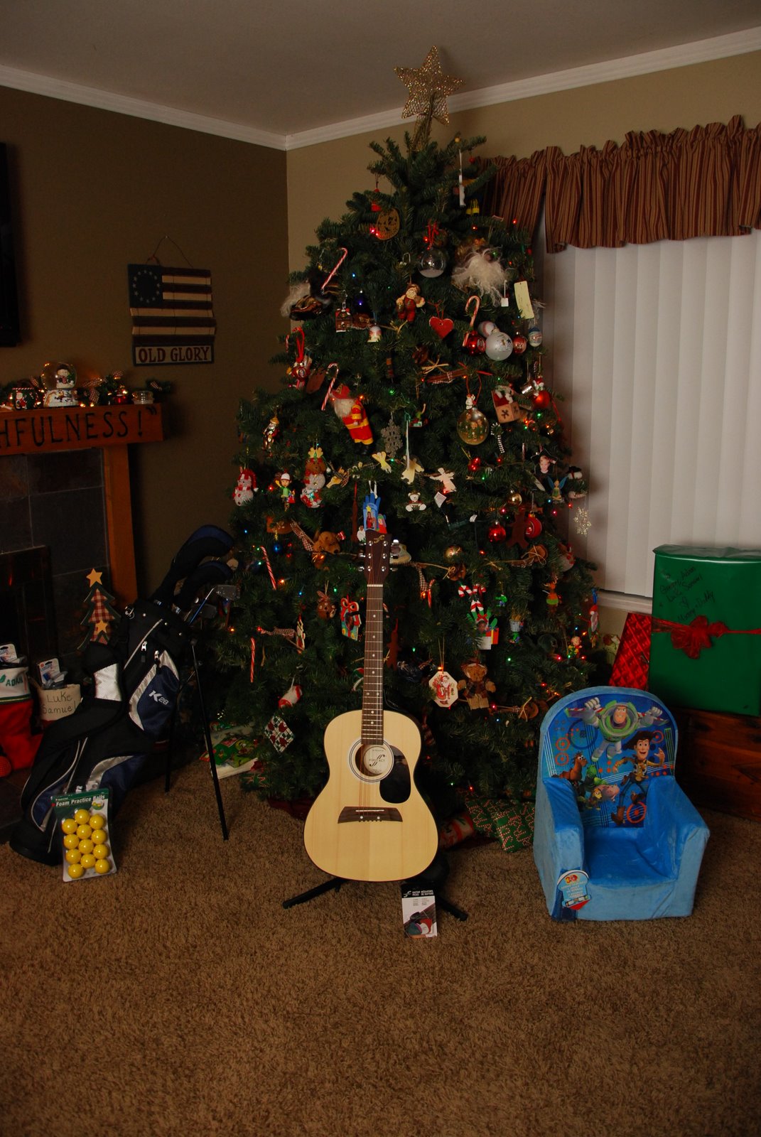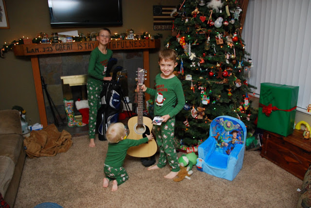 Here are the first couple taken Christmas morning. Santa came and left golf clubs for Gregory, a guitar for Adam, and a toy story chair for Luke Samuel.