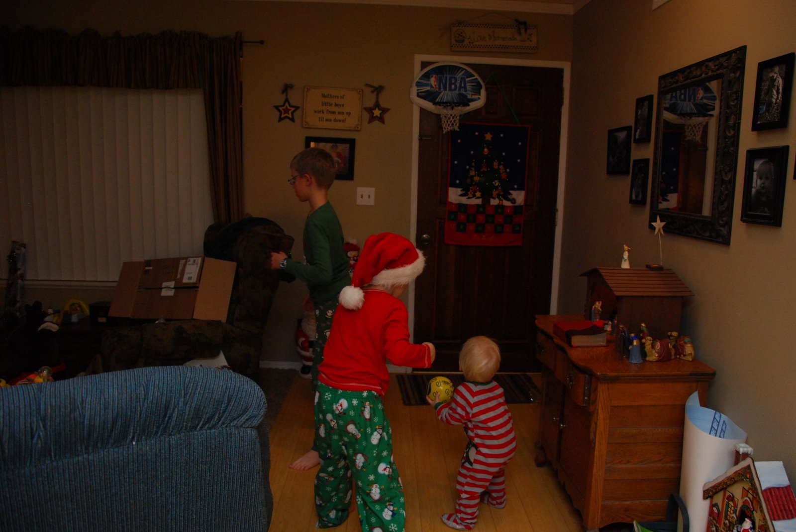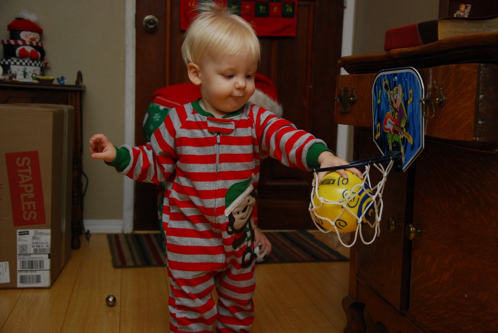 The boys moved their “room hoop” in the entry way today. Luke got a ball from Grandma Hoefler (hit of the night). We had to get another hoop low enough for him.
