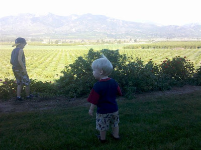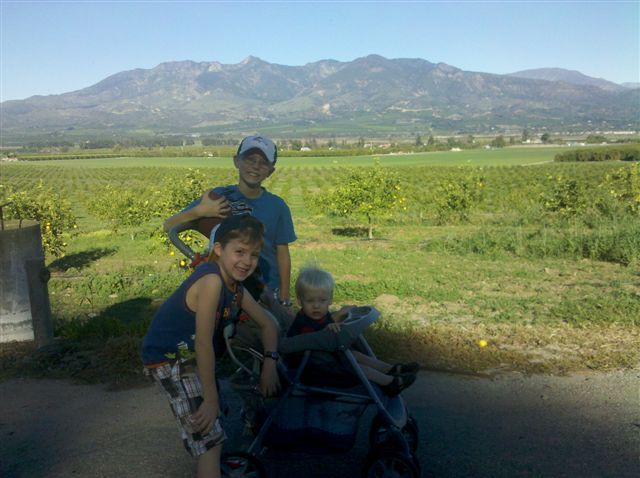 | We are having some pretty SPRING WEATHER in January here in So. California. Perfect weather to go walking in. We headed out to Bardsdale near our old house. It was fun going for a walk. Luke loved being outside. Adam rode his bike and really enjoyed that. We visited with a few of our old “neighbors” and we picked some navels from some friends trees (thanks Palmers and Marjie!) I didn’t bring along my good camera, although I wish I had, it was so pretty outside! Here are a few shots of the cutie pies! |