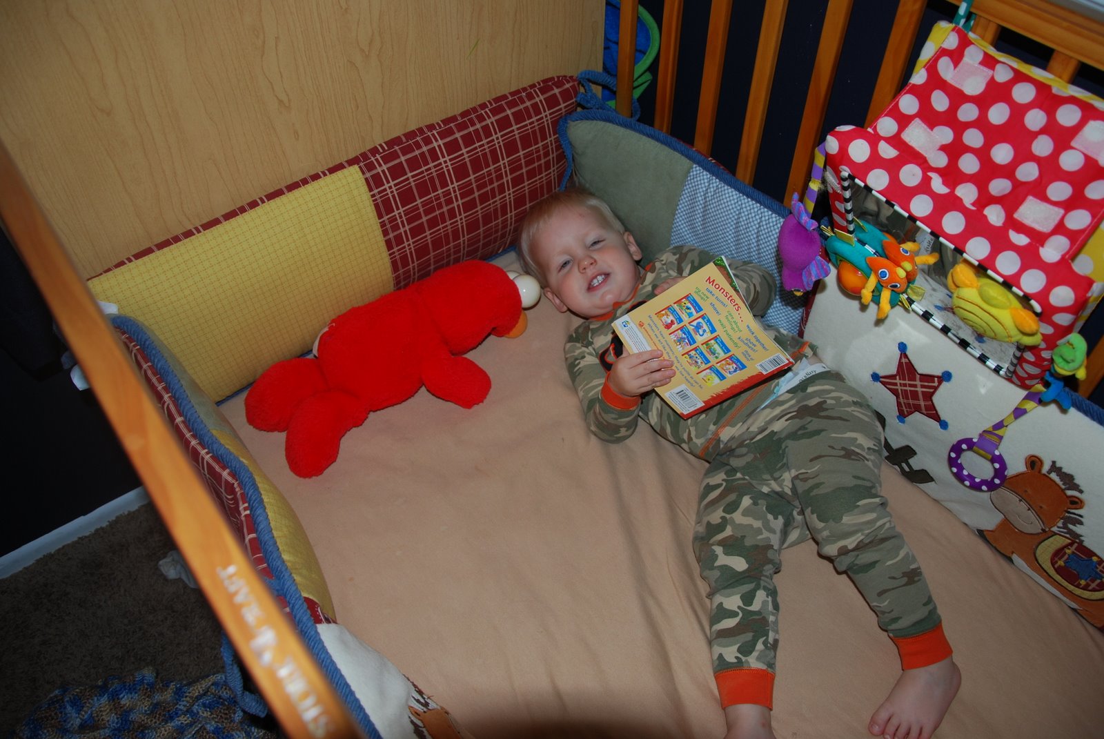 Tonight we put him to bed and he wanted Elmo. Brian and I were laughing because we could hear him jabbering away in there and constantly saying “mo mo mo mo” (Elmo). This jabbering went on for over 1/2 hr. I went in and caught him reading an ELMO book to Elmo. It was sooooo cute!! I was able to snap a shot!! Normally he won’t have ANY stuffed animal, blanket or anything near him when he sleeps. I’m wondering where Elmo will be later in the night 🙂