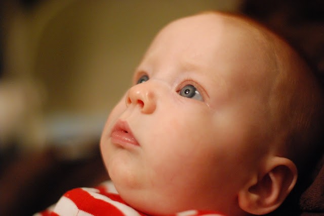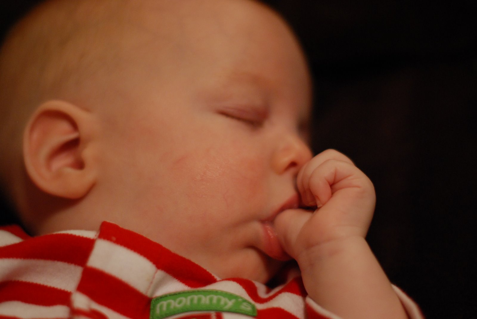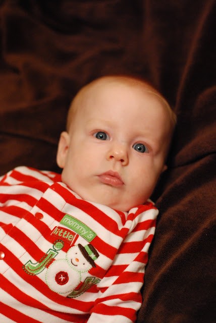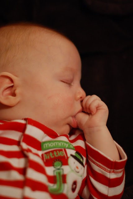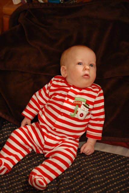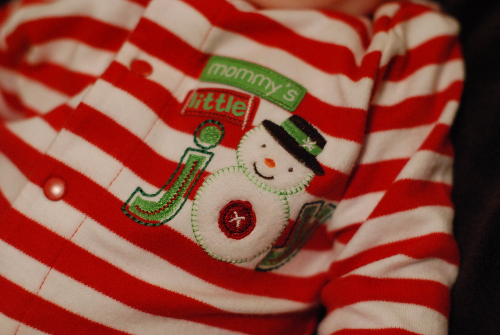 I bought this sleeper years ago. I bought it really cheap, it was on sale. I bought it hoping it would fit perfectly to a little one that was to be born September 2009. That little one never came, never had a home here on earth. In fact I lost three babies (Sept ’08, Dec. ’08 and Jan ’09) Luke was born November 2009 so he was too tiny for this little Christmas sleeper. I decided to hang on to it and keep in one of the containers that I have that I put new Christmas stuff in each year. I pulled that container out, and found this sleeper. Perfect for my almost 3 month old little guy. Perfect for the season too. And yes…….. you are one of “Mommy’s little JOY” | |