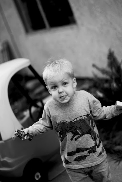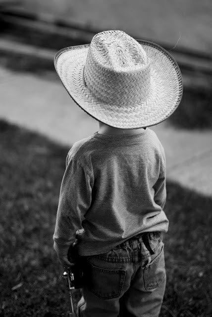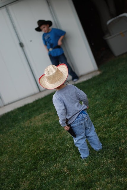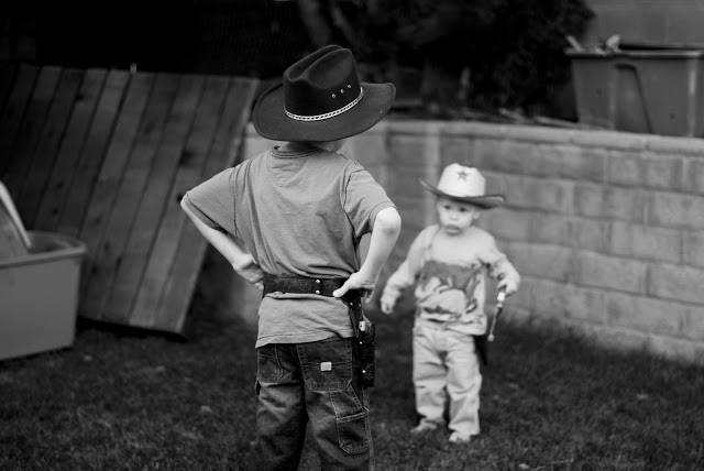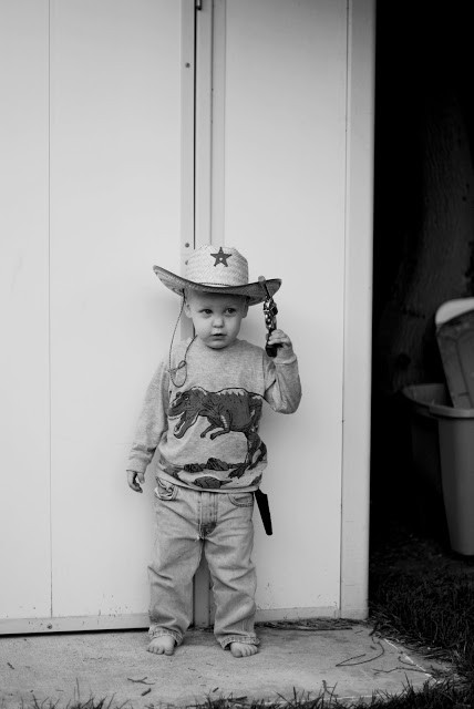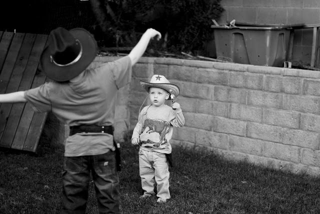 Oh my gosh, this is the cutest thing I've seen in a long time! Imaginative play means soooo much! Glad you guys realize that! I LOVE the B&W one of Luke with the gun to his cap…you should post that one on FB. "The Barefoot Kid"…haha! I also really like the ones of them both together, looking like they're about to shoot it out, or just did…numbers 3 and 7. So fun and so cute. Thank you very much for sending them!