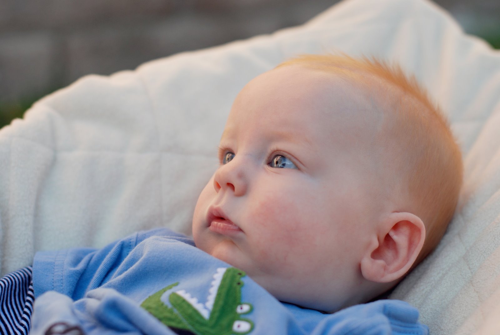 Luke at this age was still pretty red but starting to grow in the blond hair. So far I don’t see that with Gideon.