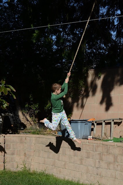 Adam is always coming up with “tricks” while he’s on the rope swing. Today it was throwing the light saber while swinging and trying to make it over the zip line rope! He’s such a boy!