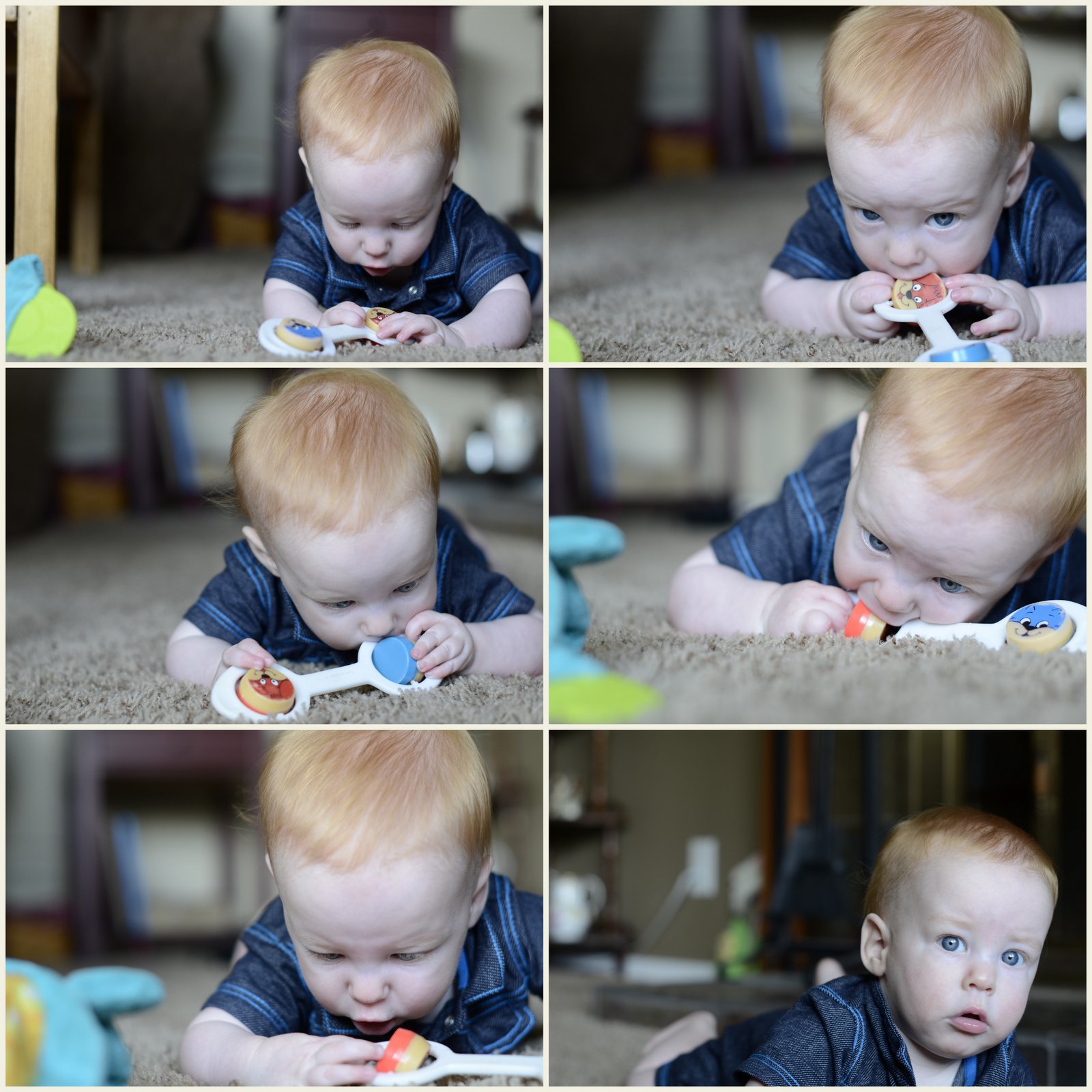 Gideon really looks cute. That rattle sure looks like one you guys played with when you were little. 🙂