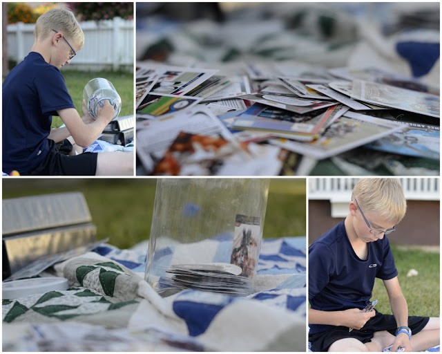 Gregory has been collecting baseball cards for years now. He keeps them organized in folders and a jar. Yesterday when we were out we got him a price guide magazine so he can look up his cards and see what they are worth. He’s got a few cards that are worth a little bit of money. Kinda fun for him to look through and see if he has some “good cards”. We sat outside last night and looked through it.