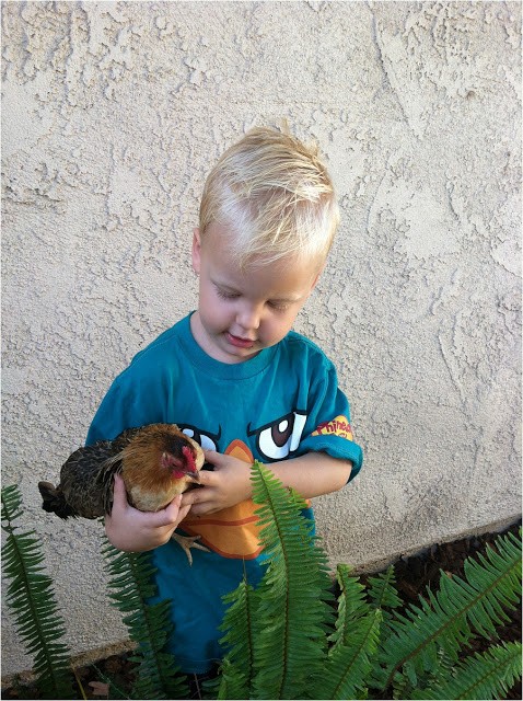 And here a little later in the morning.  Every morning he goes to let these little ones out and plays with them. I have never seen someone love chickens so much! He’s pretty good with them too.  Very good about getting them all (even the bigger ones) back in the coop.