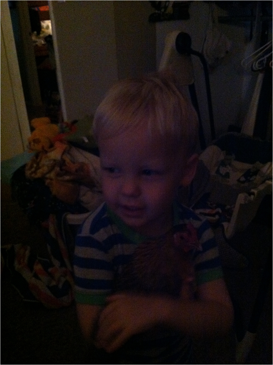 So, Luke still has this great love for his chickens.  Especially his pair of bantams.  The other morning Brian got up for work early to go out back to fix a sprinkler, and forgot to dead bolt the back door when he left.  All were sleeping (or so I thought).  I was in bed reading my Bible.  I thought I heard the back door open/close.  Next thing I know, Luke is standing by my bedside with his little hen (see dark picture).  He said “girl one has poop on her, help me keen if offff, peease”.  I had to get a wipe and help him get the poop off her little foot.  This is all at 6:30 in the morning!!!! He also told me she needed a “cuddle” from him.