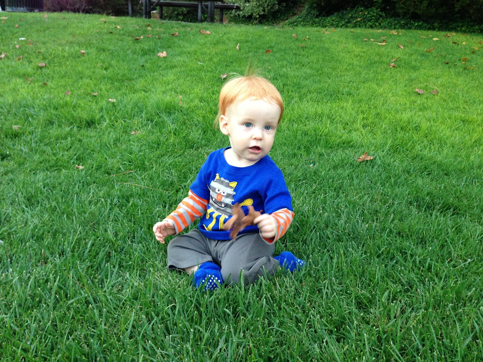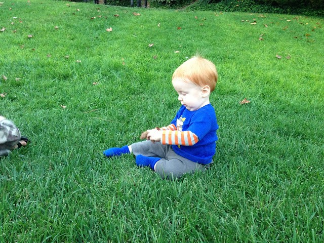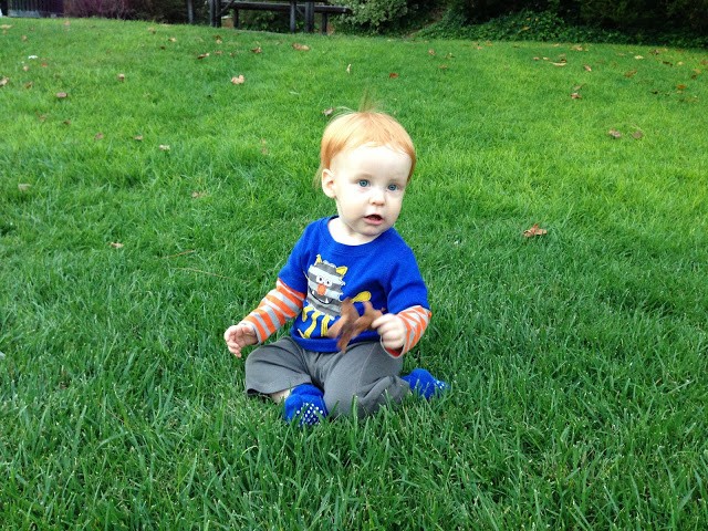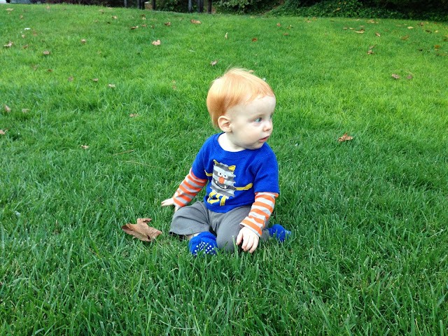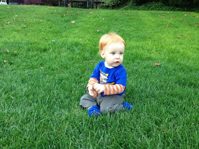 I love this new little outfit we bought Gideon. Super soft and comfy. His hair sure is bright orange with that green grass backdrop.