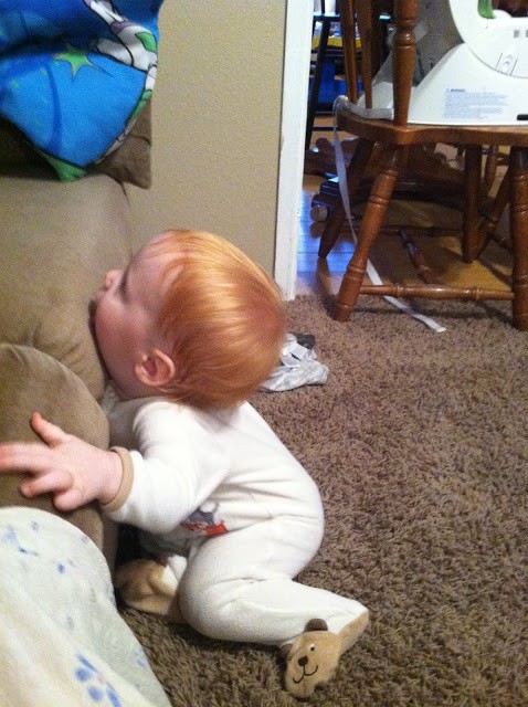 Gideon got to a standing position four times in a row tonight. Luke and I sitting on the couch in the family room and up pops Gideon trying to get snacks.