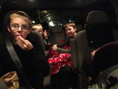 Our second annual light looking trip! The boys had to find the hidden GOLDEN tickets, and get cozy in PJs. I made homemade hot cocoa, and popcorn. We loaded up in the MINIVAN EXPRESS and went on our little trip. We had fun looking at Fillmore lights in the rain.