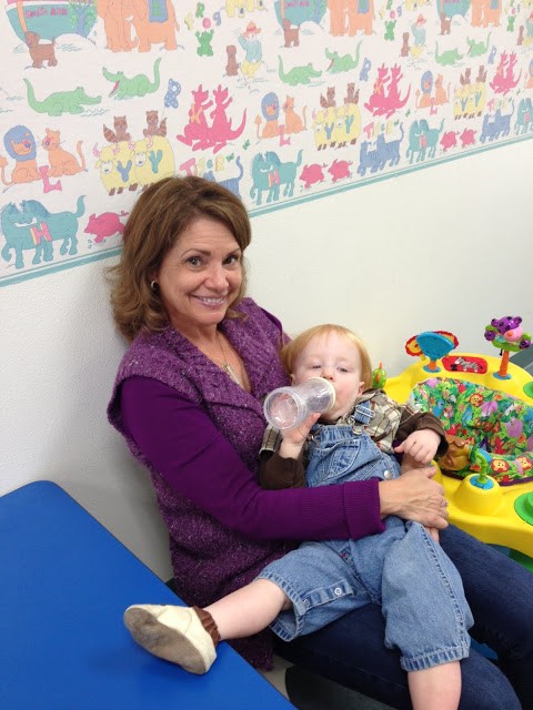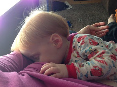 | When I came to pick him up from nursery he was all sleepy with Terri. Just kicking back relaxed! So sweet.! |