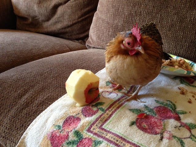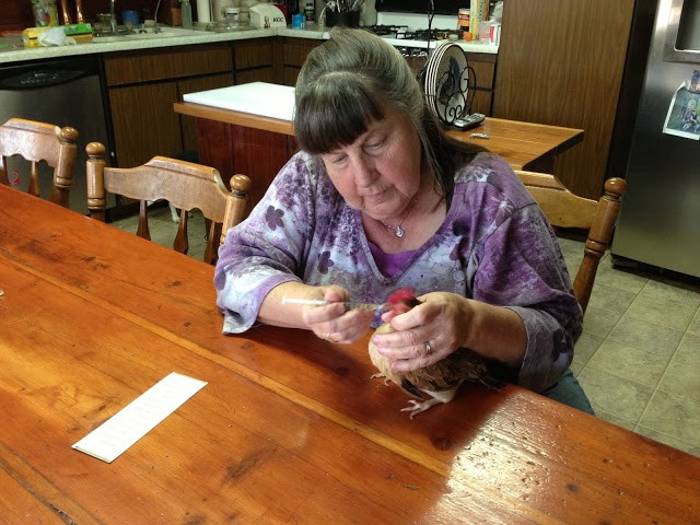 | We noticed girl acting a little strange last night. Closing eyes, puffed up, standing on one leg etc… This morning she didn’t follow rooster out of the coop when we went to let them out (like normal). We brought her in and she ate some apple and bread. Went to see the guy in Santa Paula that sold her and rooster to us. He knew a lot! Looked at the pics I took and knew we were catching it early. Its viral or bacterial. He gave us some powder stuff to mix in the water and give to her two times a day. Said in 5 days she should be looking better. If not, then its probably bacterial and he has some stuff we can give her for that too if we need it. Luke is very much in denial that she is not feeling well. Although at naptime he prayed for her. See video below |