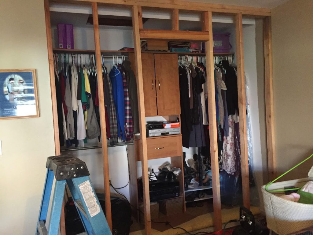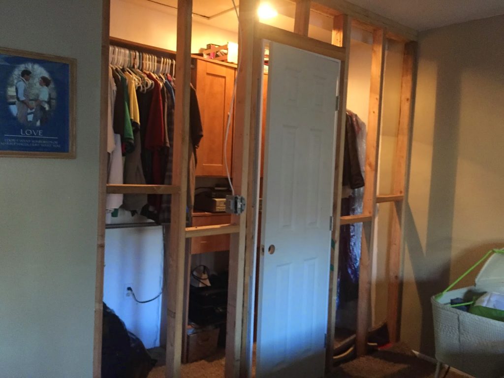 Brian has wanted a CLOSET since we moved in. We never have had one with doors. We finally got it framed and dry walled!