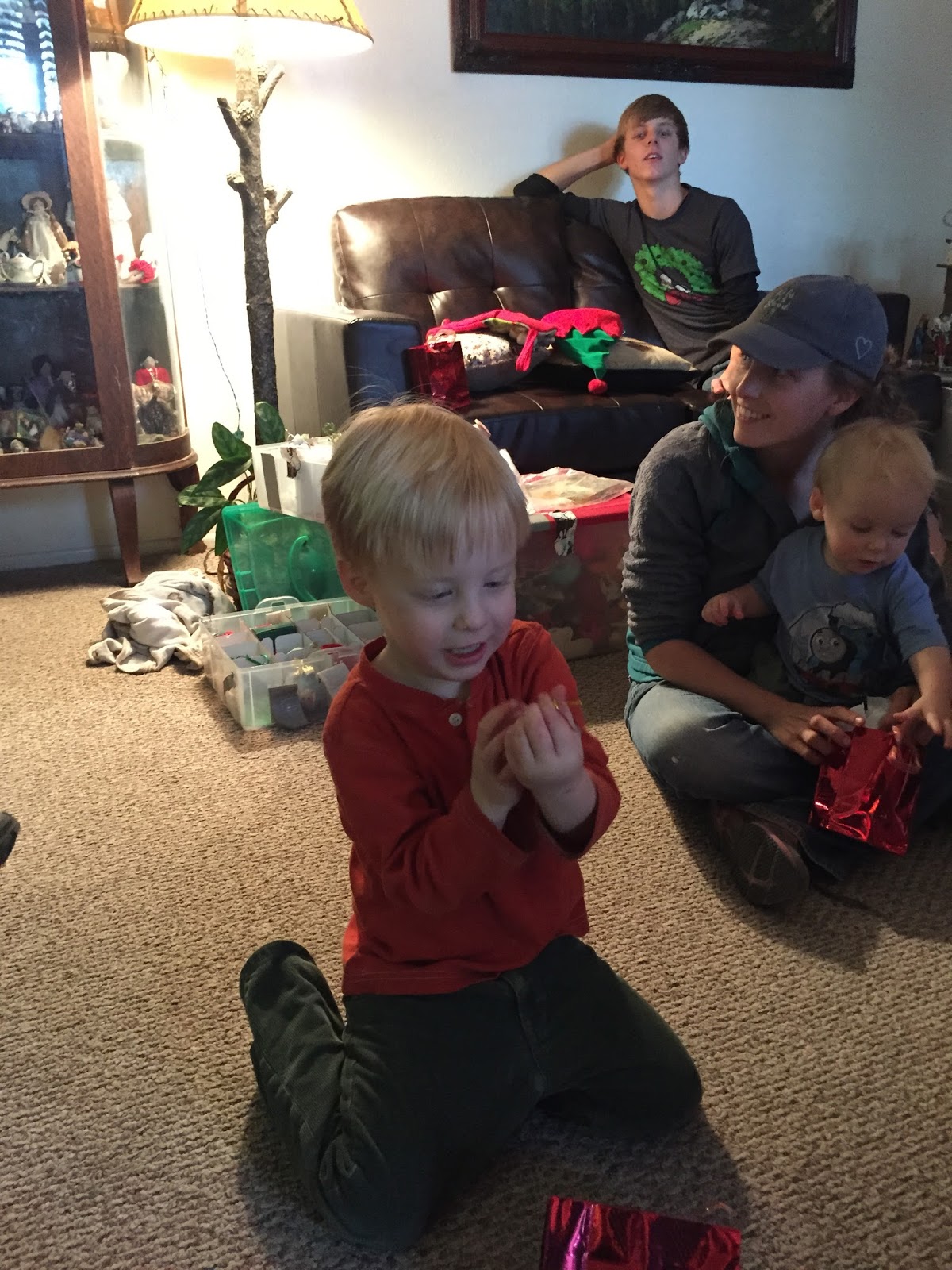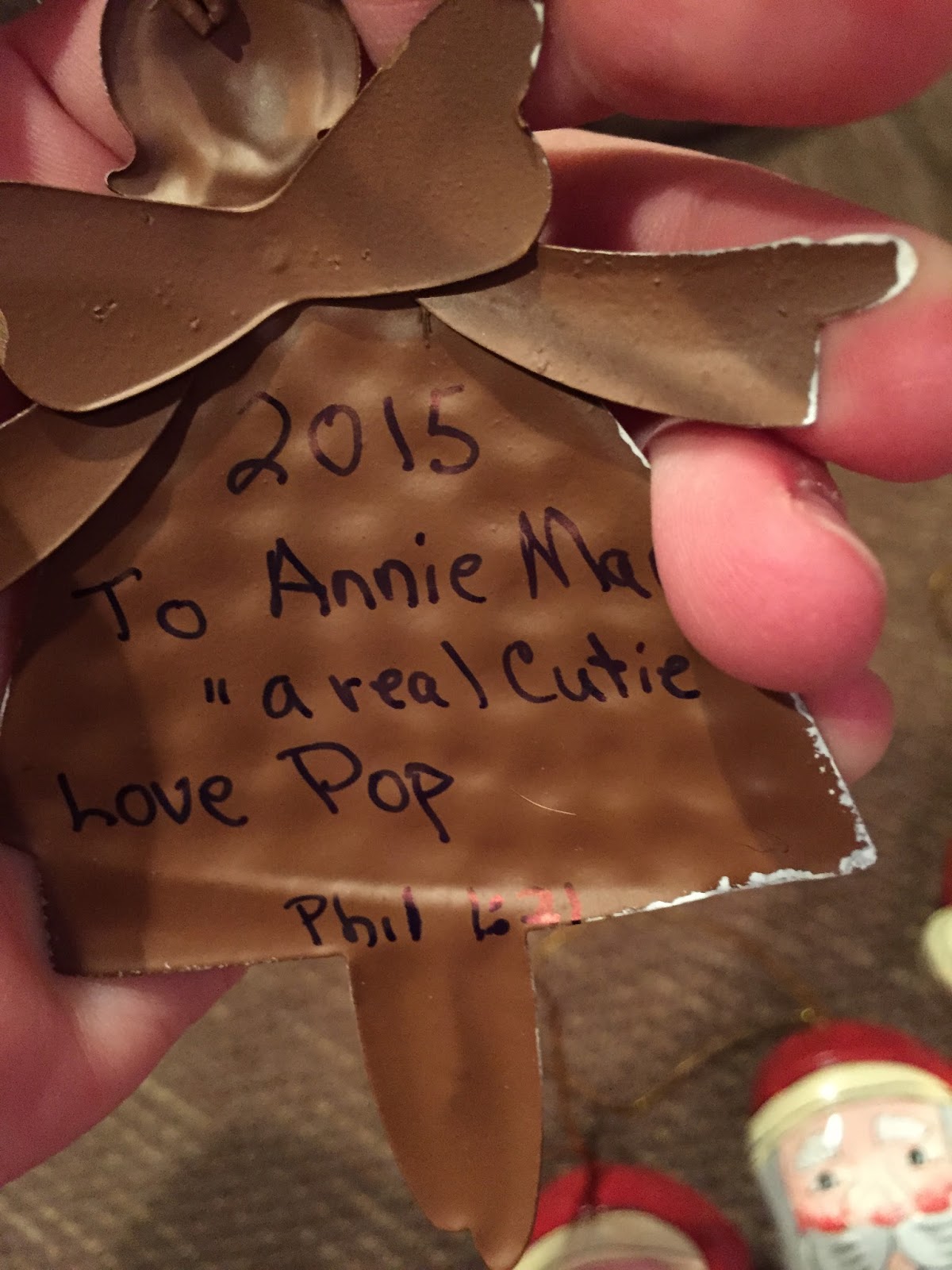 We went to Granma’s to do our annual “wassle” and decorate her tree and have thanksgiving left-overs. It was a fun time. All these “firsts” without Pop are really challenging and sad though. Since 2000 (Gregory’s first Christmas) Pop has been giving a Christmas ornament to the grandkids. He would sign them and give them out. He started off going to Green Thumb and choosing these LARGE extravagant ornaments. As the family grew it got to be too much money. So they started getting them in a catalog. Last December/January Pop and Granma looked through the catalog and Pop picked out the ones he wanted to give to the kids for this Christmas. He would sign them, date them too. This year the plan was for him to wood burn on the back of them. Never got done. Granma signed them LOVE POP (they were from him). These will be the last ones.