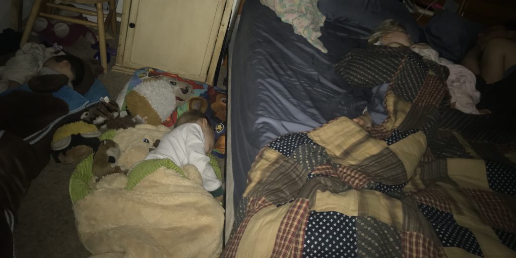 Seems lately we’ve been hit nightly with these three! Can you see them?? Good thing Santa brought them sleeping bags for Christmas! I gotta say, its pretty tricky trying to climb out of bed with a foot draped over you and trying not to step on anyone on the floor. Its an ART! I should win an award. They wake for various reasons. Trying to love on them and give lots of cuddles in the night and often times Daddy carries them back to their room.